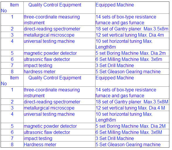 為了保證產品質量,相關的質量控制設備是前提。翼凱機械配有三坐標測量儀、直讀光譜儀、金相顯微鏡、萬能試驗機、磁粉探傷儀、超聲波探傷儀、沖擊試驗機等檢測設備。 公司還擁有有機樹脂硅酸鈉自凝砂、二氧化碳硅酸鈉砂四條生產線,14臺箱式電阻爐、煤氣爐。車間各類起重設備180余臺,金屬加工設備200余臺,其中3.5mx8 m龍門刨床、最大4米立式車床等大型設備40臺。
